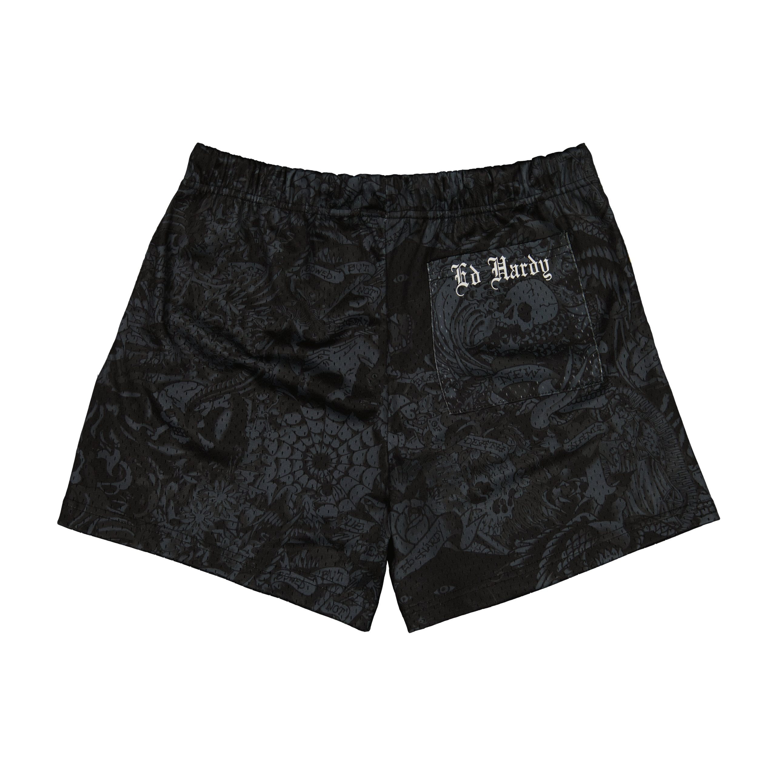 Classic basketball short silhouette cut from a double ply mesh. Features three pockets and an adjustable drawstring. Includes cobra flame graphics layered over allover tattoo print. Complete with a signature Don Ed Hardy logo.