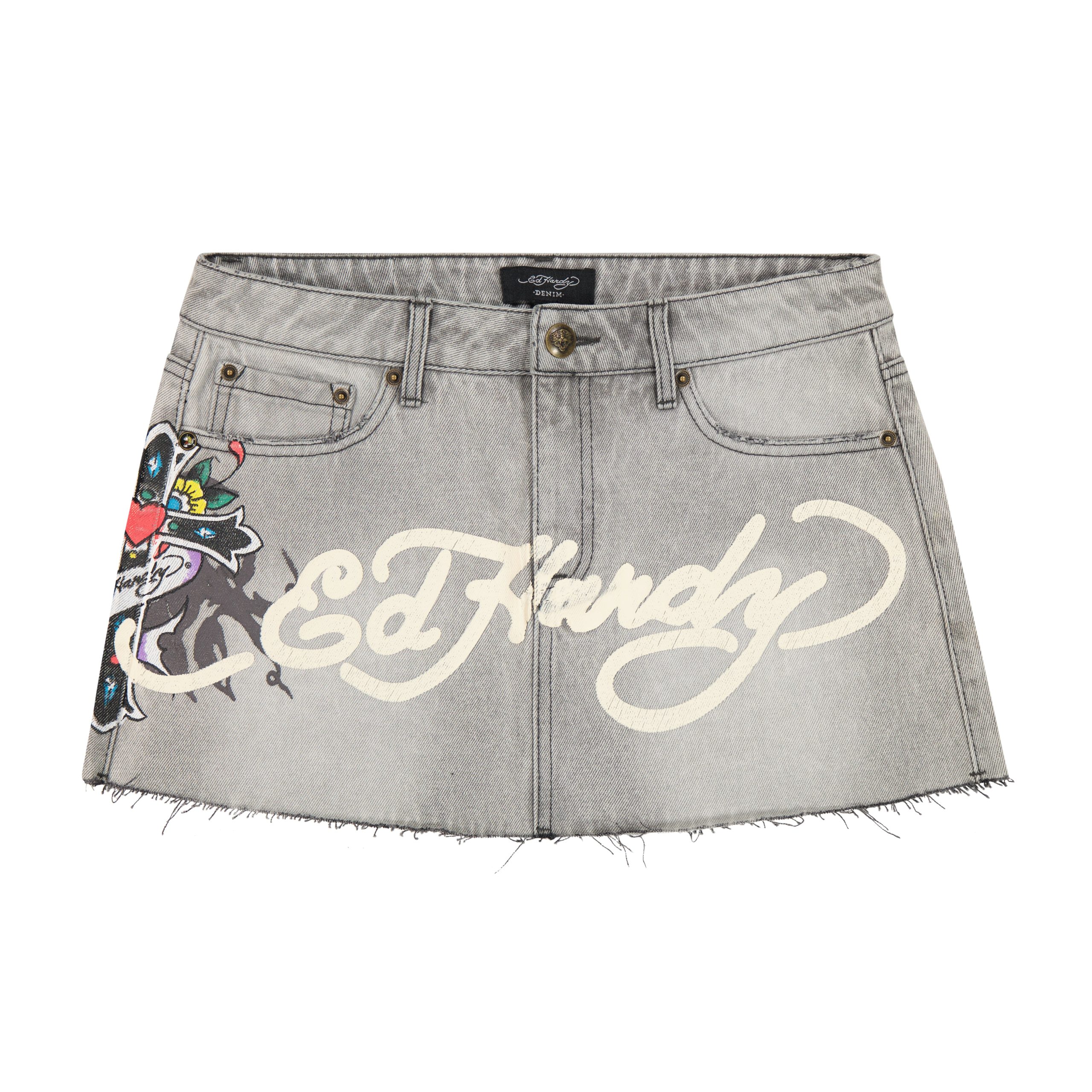 Embrace the Y2K revival with our vintage inspired denim mini skirts. Complete with archival Ed Hardy artwork and a signature logo.