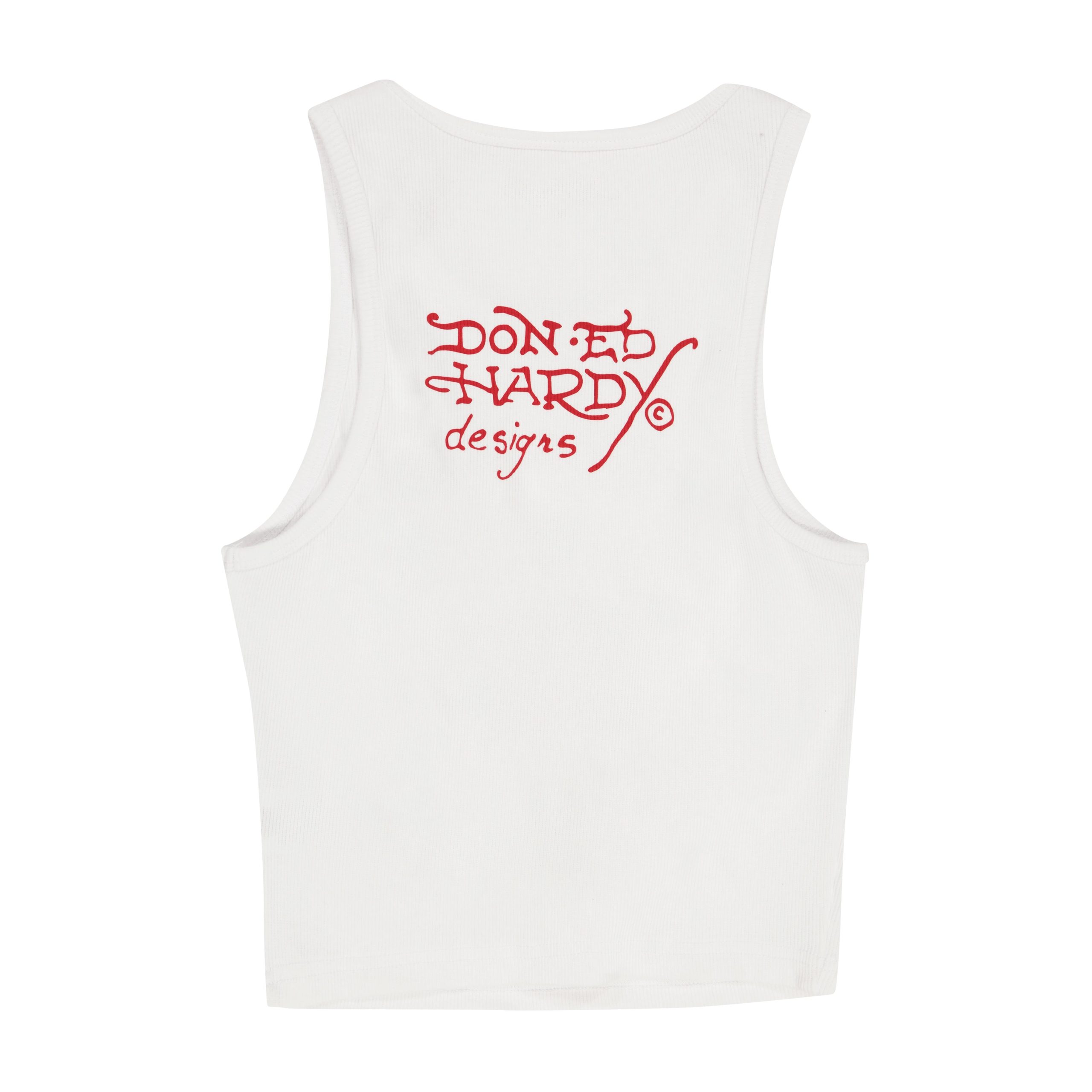 Slim fit cropped tank top with a vintage feel. Features multiple archival logos and a signature Ed Hardy cross graphic adorned with rhinestones.