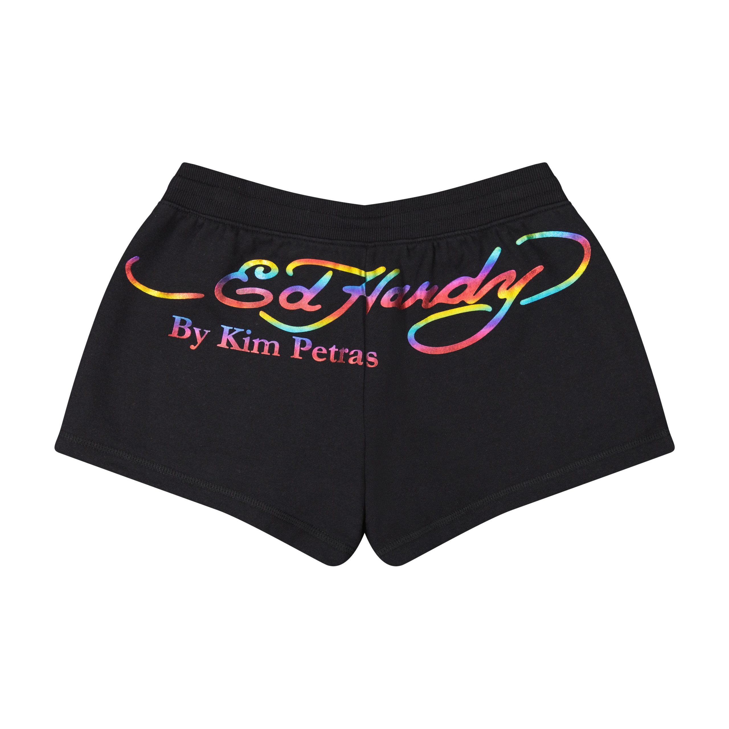 These fleece mini shorts feature an archival dagger girl graphic. complete with an Ed Hardy by Kim Petras rainbow foil logo.