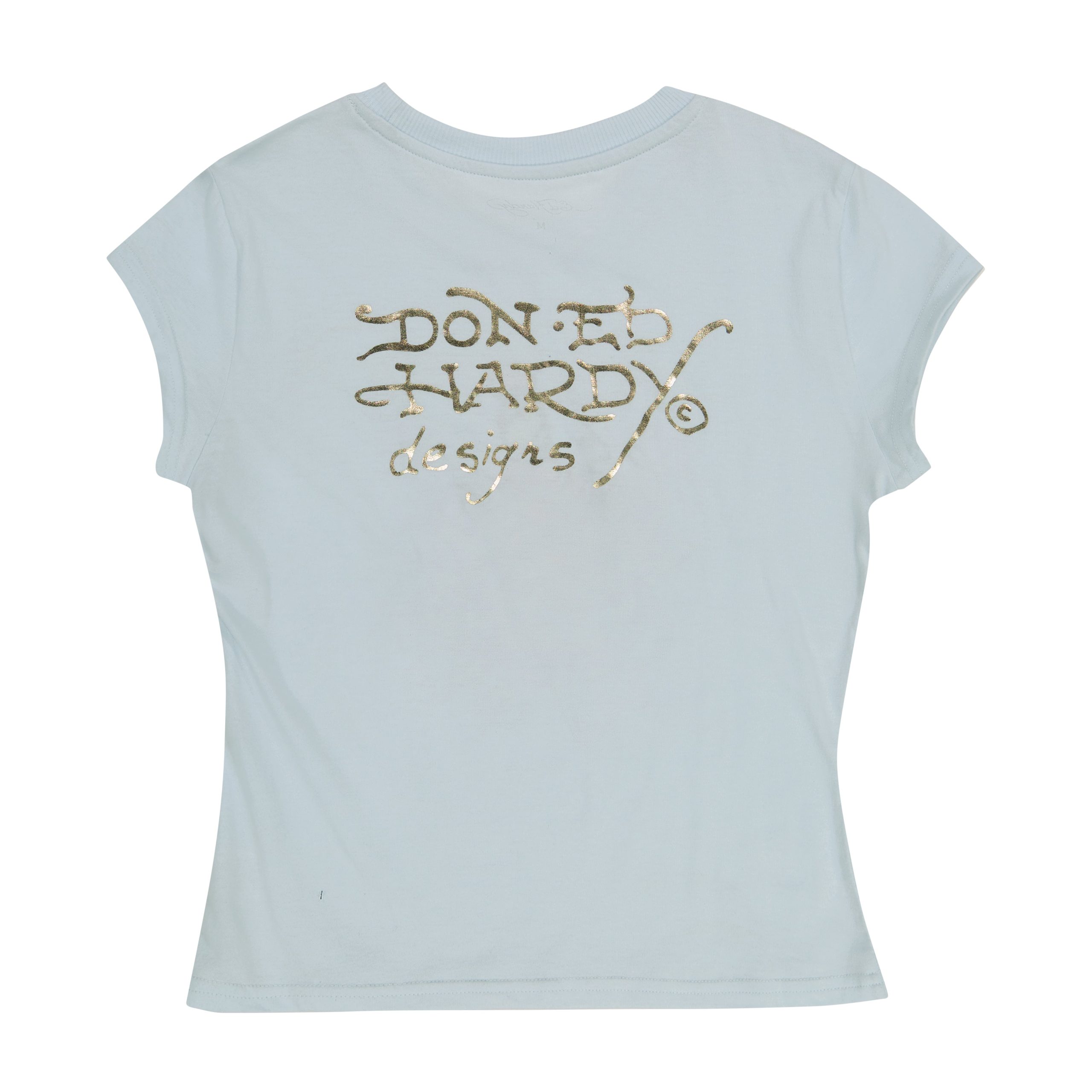 Cap sleeve fitted tee cropped at the waist. Complete with a layered Ed Hardy dagger heart graphic and a gold logo.