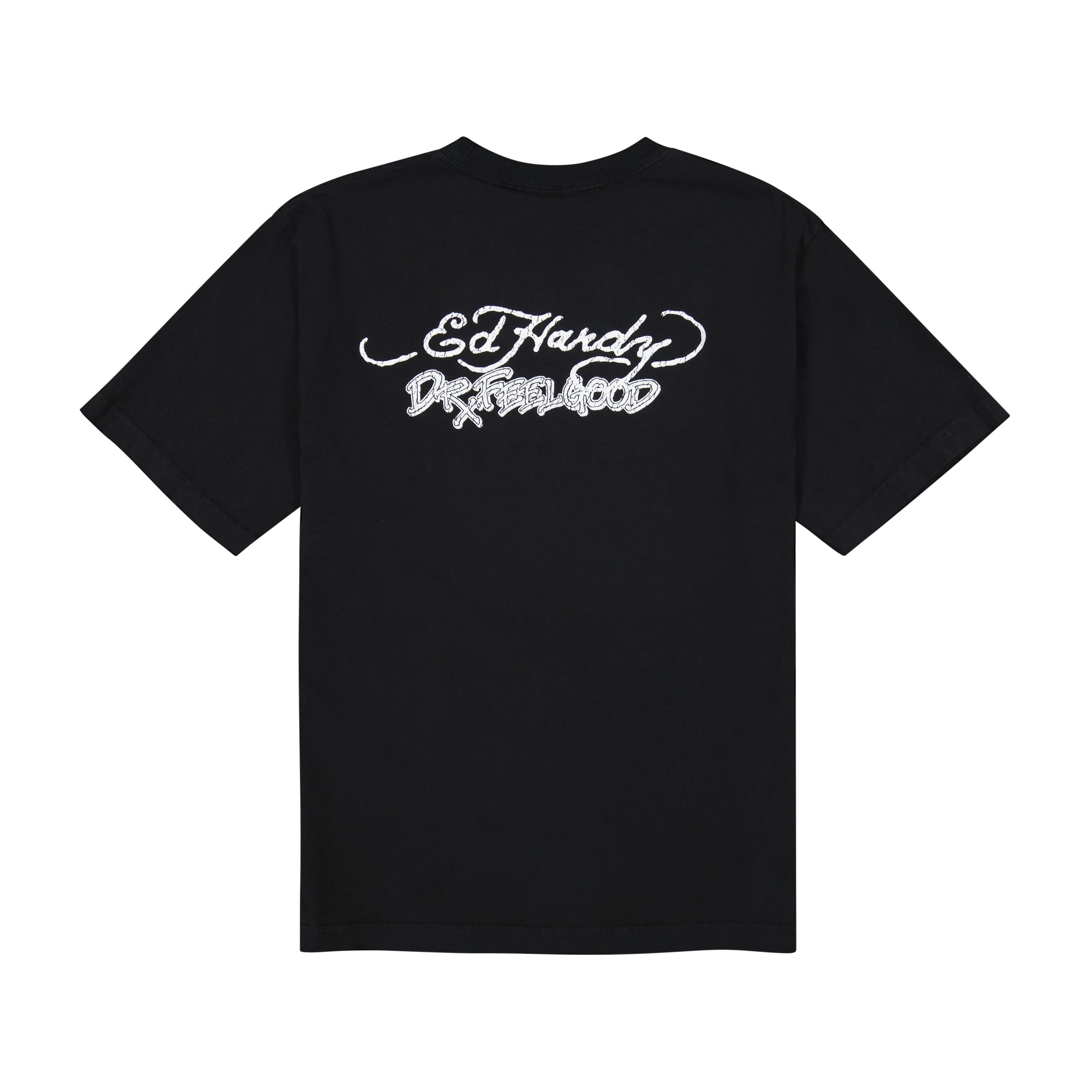 This heavyweight boxy tee features a thick rib. Ed Hardy logo. and a Motley Crue Dr. Feel Good graphic