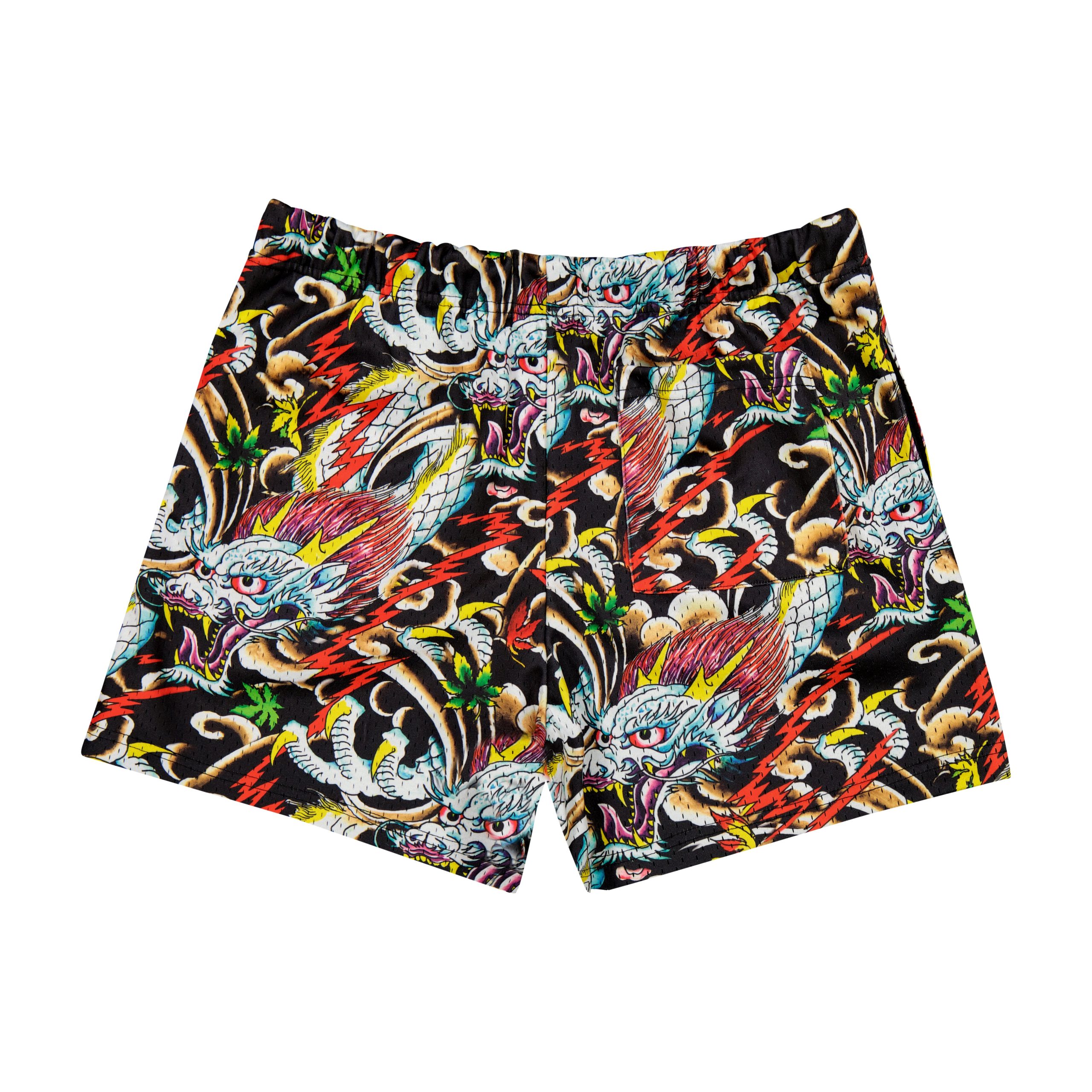 Classic basketball short silhouette cut from a double ply mesh. Features pockets and an adjustable drawstring. Includes an allover dragon tattoo print.