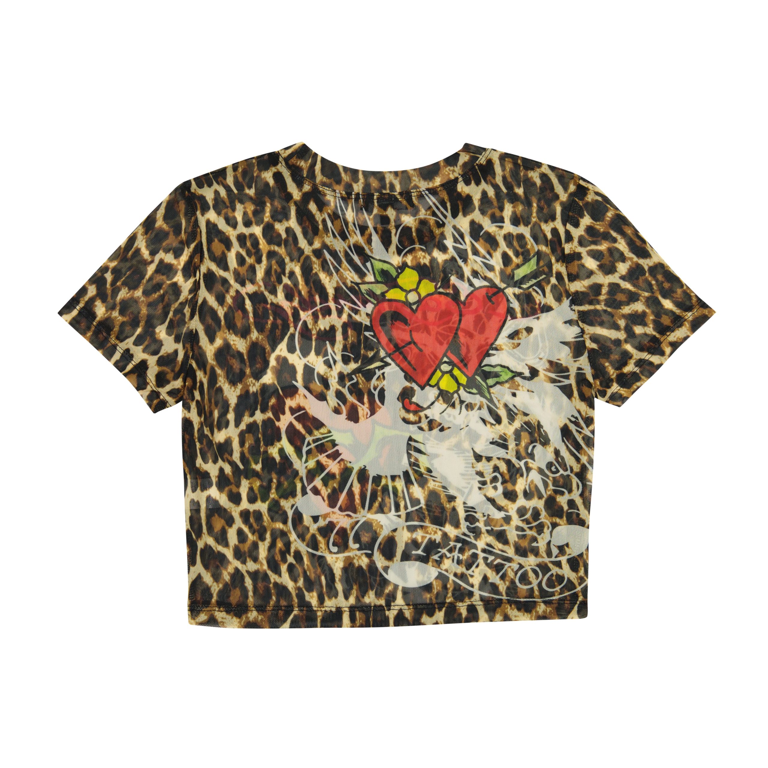 Signature baby tee silhouette cut from a power mesh in a leopard print. Features layers of archival Ed Hardy artwork and logos.?