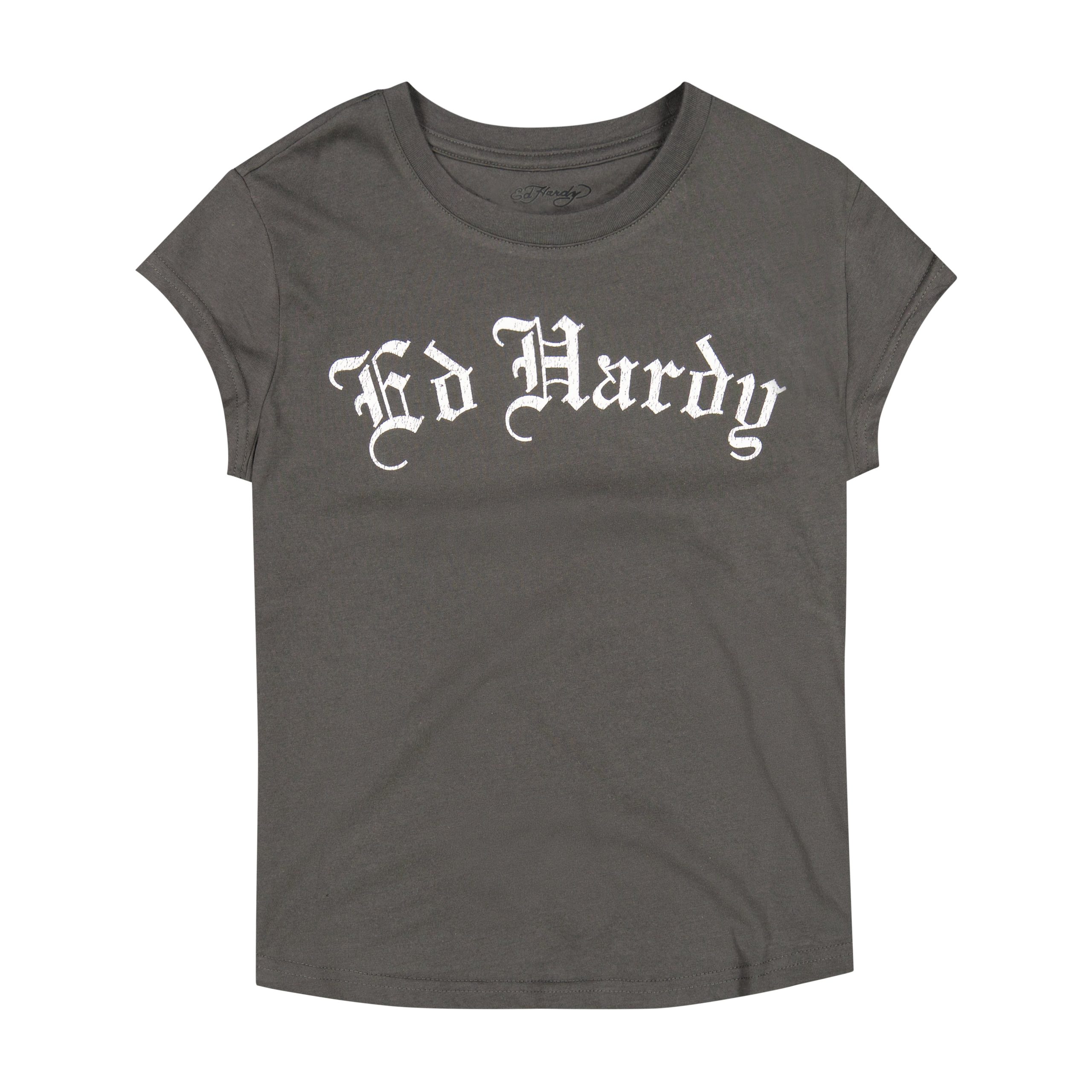 Cap sleeve fitted tee cropped at the waist and cut from a cotton poly blend in Charcoal. Complete with archival logos and an Ed Hardy NY Eagle graphic.