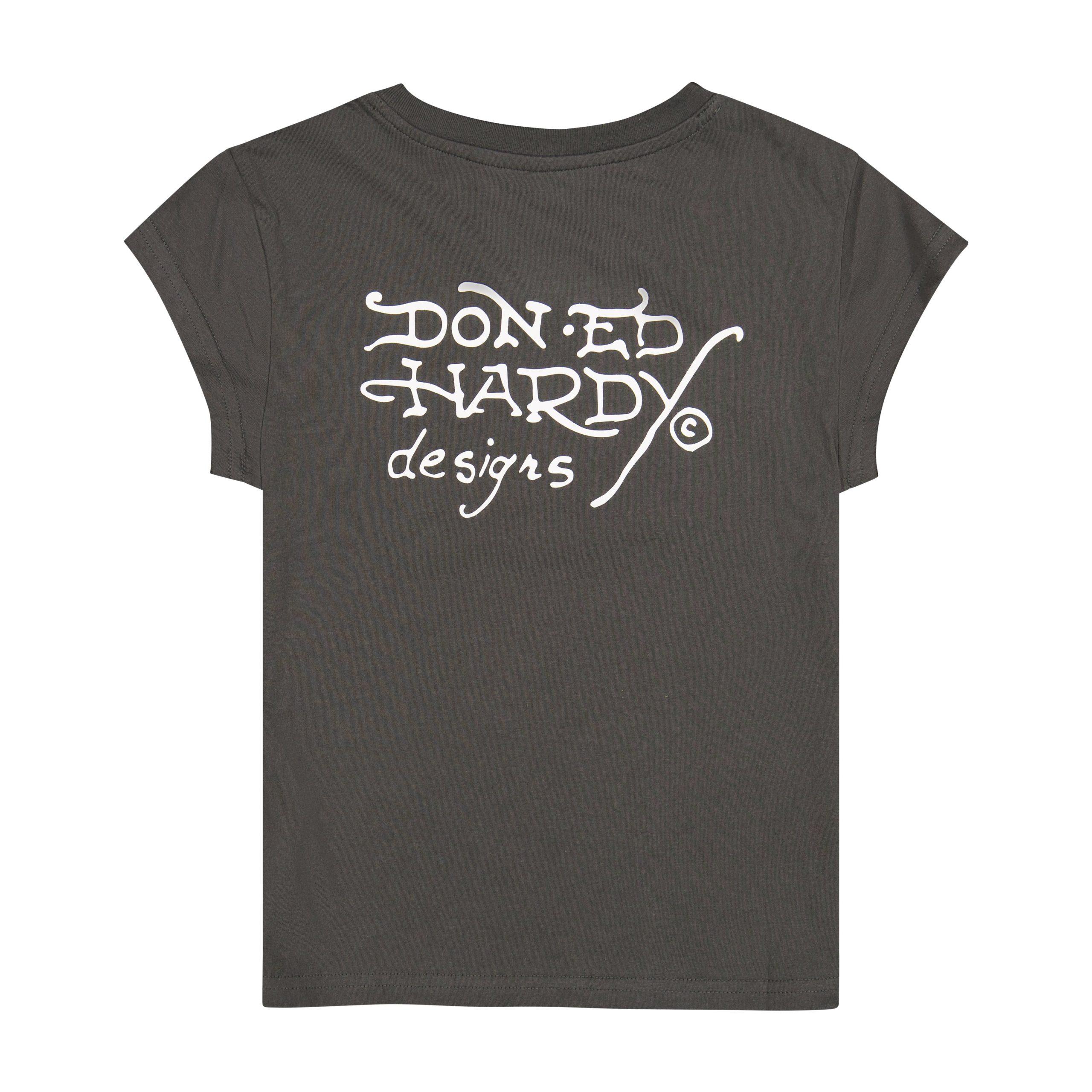 Cap sleeve fitted tee cropped at the waist and cut from a cotton poly blend in charcoal. Complete with archival logos and layered Ed Hardy graphics.