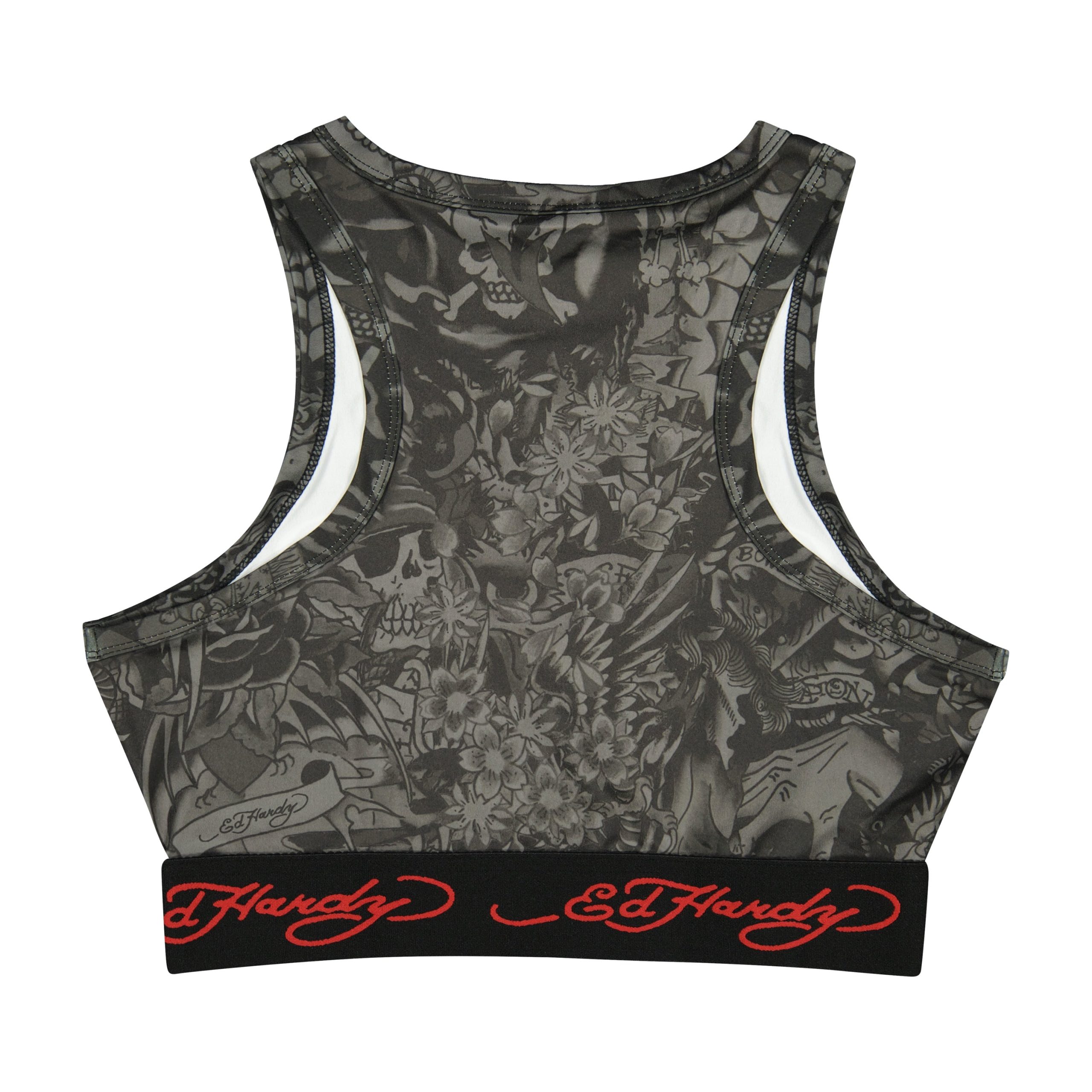Sport tank cut from a sleek and flattering poly-spandex blend in an Ed Hardy tattoo collage print and Old English logo. Features a stretch waistband and complete with a signature Ed Hardy logo in red.?